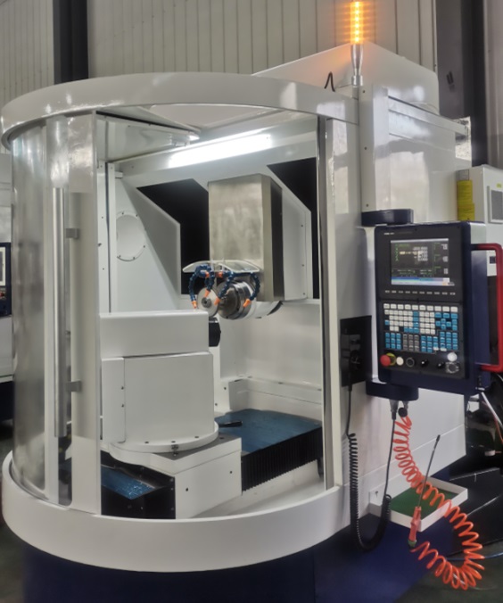 該機床是為磨削φ130*88*1mm圓盤刀片(見工件圖《上刀圖》)而作的專用機床,根據用戶原加工工藝,該機床采用三個數控直線軸X、Y、Z,采用三軸滾珠絲桿(臺灣銀泰),直線導軌(THK)臺灣新代伺服電機。及臺灣新代系統控制器。該機床在Y軸滑臺上裝工件旋轉軸總成。按照工件法蘭結構示意圖裝夾工件,工件旋轉軸總成可根據工件角度手動調整(調整范圍-10--60度)。工件旋轉軸電機采用臺灣新代伺服主軸電機。在Z軸滑臺上安裝電主軸。主軸升降行程200(工件旋轉中心向上100mm,向下100mm)。磨削砂輪通過砂輪桿安裝在電主軸上。在工件軸旁邊安裝砂輪修整器,可對砂輪端面進行修整,保證砂輪型面及砂輪鋒利度(電子手輪進給)。加工時X、Y、Z為數控進給運動將原工藝的手動進給轉變為數控進給。